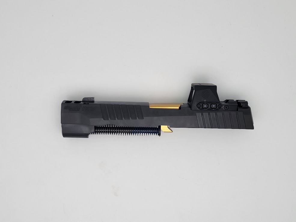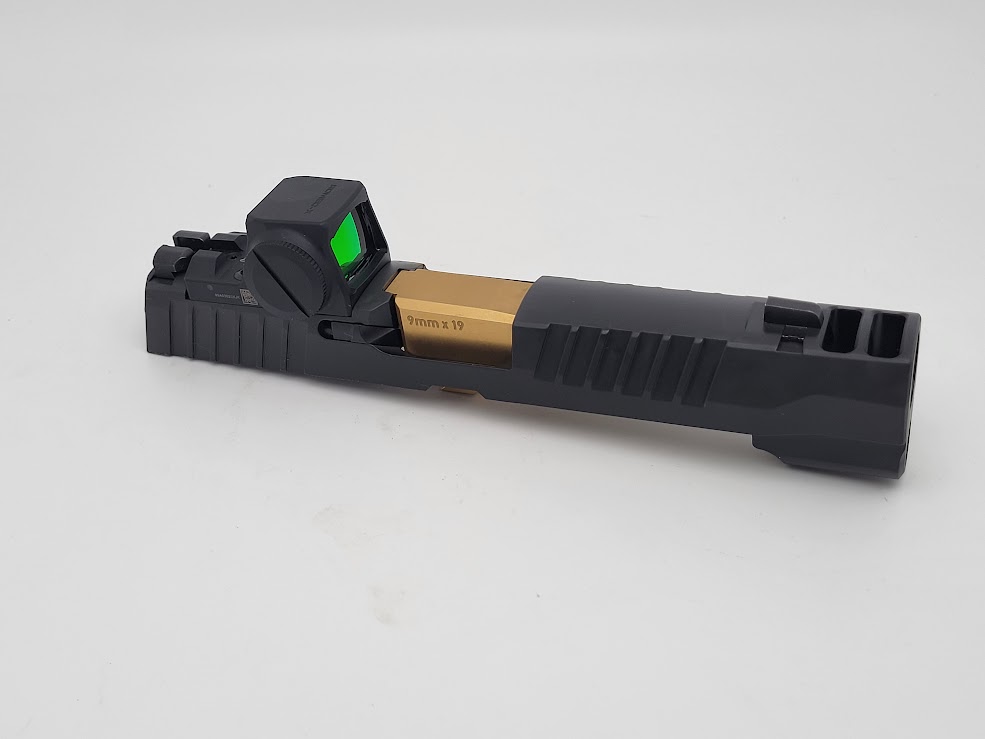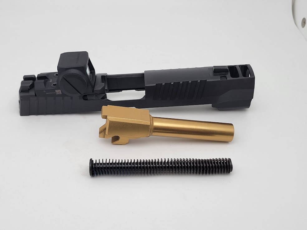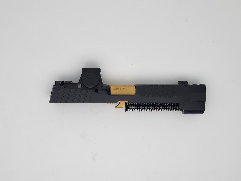Included: Complete slide assembly with XRAY3 day/night sights, Barrel 3.9″ TIN “GOLD”, Recoil assembly & ROMEO X PRO