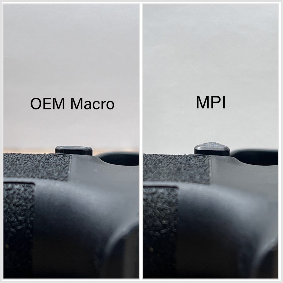 Made as a direct replacement for the oem Macro mag release to be installed on all factory and aftermarket grips/frames that require the “standard” catch.  Extended over standard P365 mag catches and maintains the same height as the factory macro catch but with a flat button profile for improved reach.