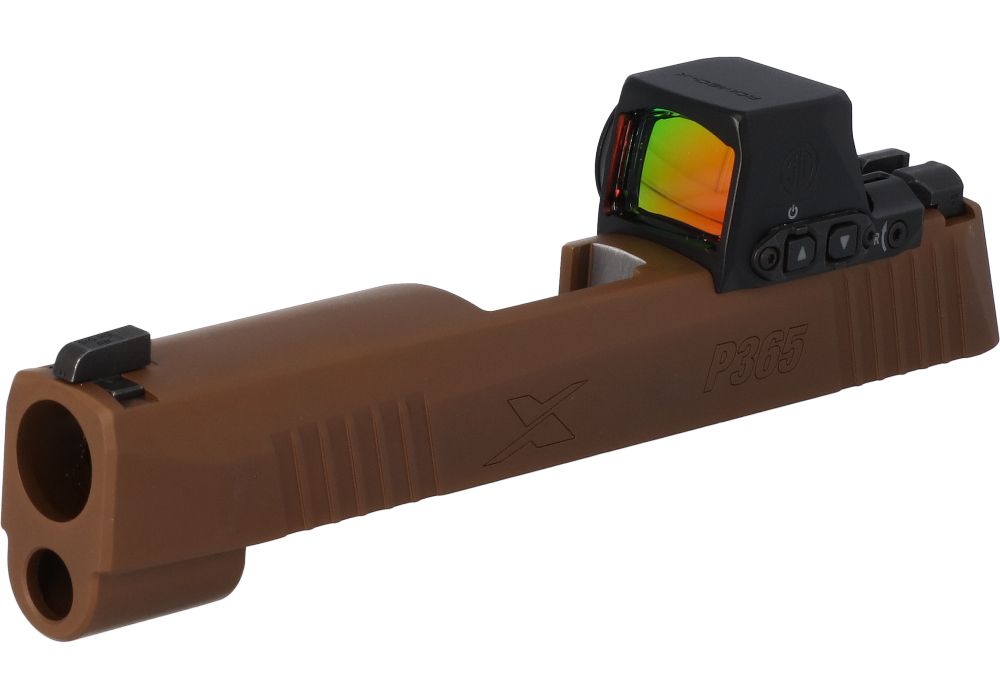 Enjoy using a slide-mounted reflex sight without needing suppressor height iron sights. The factory-installed ROMEO-X COMPACT optic sits incredibly low to the slide so you can enjoy co-witness with the included standard height iron sights, giving you a consistent, familiar sight picture. Factory replacement 3.7″ 9MM slide for the P365XL. Compatible with all P365 9mm models and configurations with the following accompanying items: P365/P365XL 3.7″ barrel, and recoil assembly.